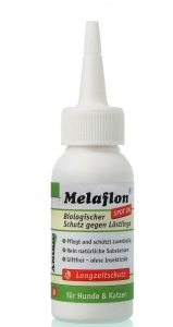 Antiparasitario externo "Melaflon Spot-on" de Anibio. Protege contra garrapatas, pulgas, mosquitos y ácaros. Fabricado con sustancias activas vegetales como el geraniol. Aplicación en gotas sobre el cuerpo del animal.