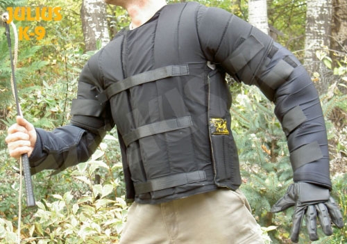 La chaqueta es totalmente ajustable mediante tiras de velcro y las mangas son desmontables. Se pone oculta bajo la ropa para las sesiones de adiestramiento.