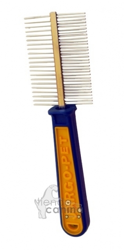 Peine doble de púas metálicas con mango ergonómico de caucho, recomendado por Veterinarios para su uso habitual.