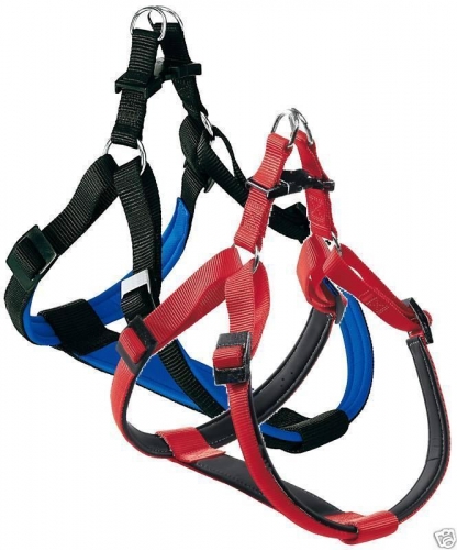 Arnés de nylon de gran calidad, acolchado con neopreno y de diseño ergonómico de la marca Ferplast. Disponible para perros pequeños hasta muy grandes. Disponible en rojo, azúl y negro. Muy útil tanto para el paseo de perros difíciles como para perros de traílla.