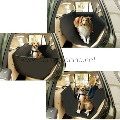 Dispone de dos piezas laterales de "quita y pon" de cremallera, para proteger también las puertas y el salto descontrolado hacia el exterior. El perro puede compartir el asiento trasero con alguna persona.