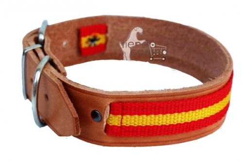 Collar de Cuero de vaqueta natural ancho con bandera incrustada para perros grandes. Completamente realizado a mano con acabados finísimos. Ideal para perros de rehala o para razas de molosos.