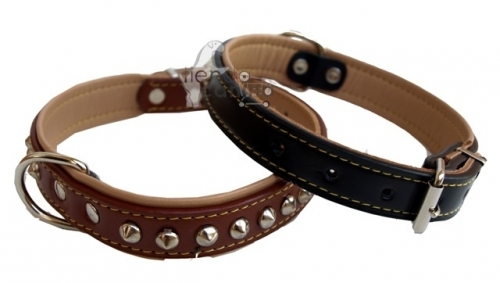 Collar de cuero forrado con adornos metálicos para perros medianos y grandes. Disponible en negro y en marrón.
