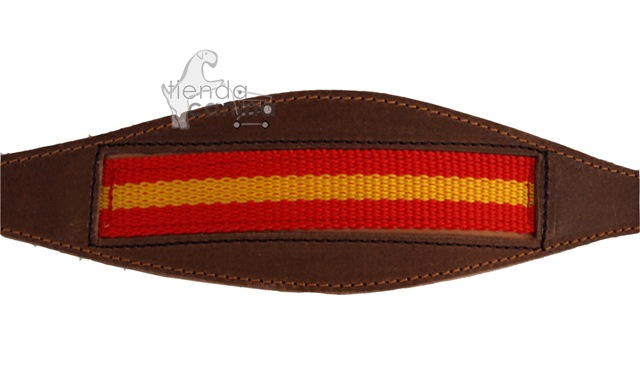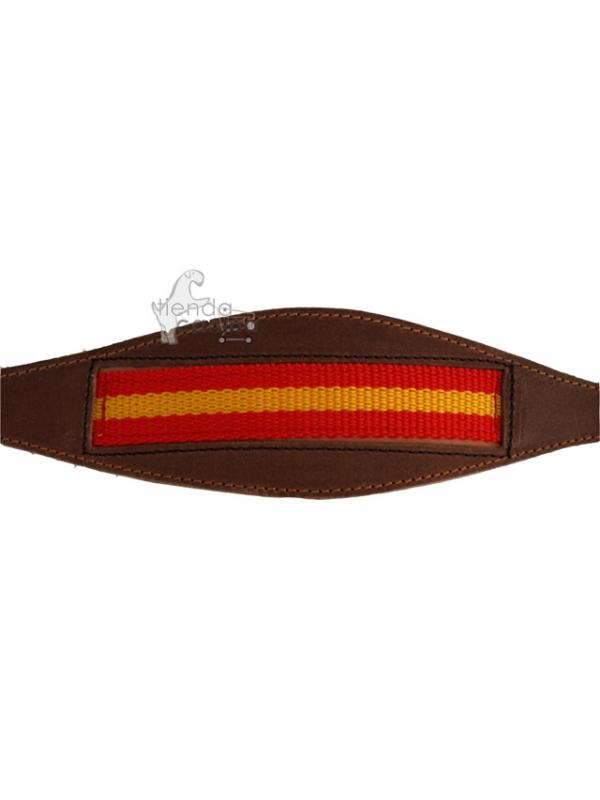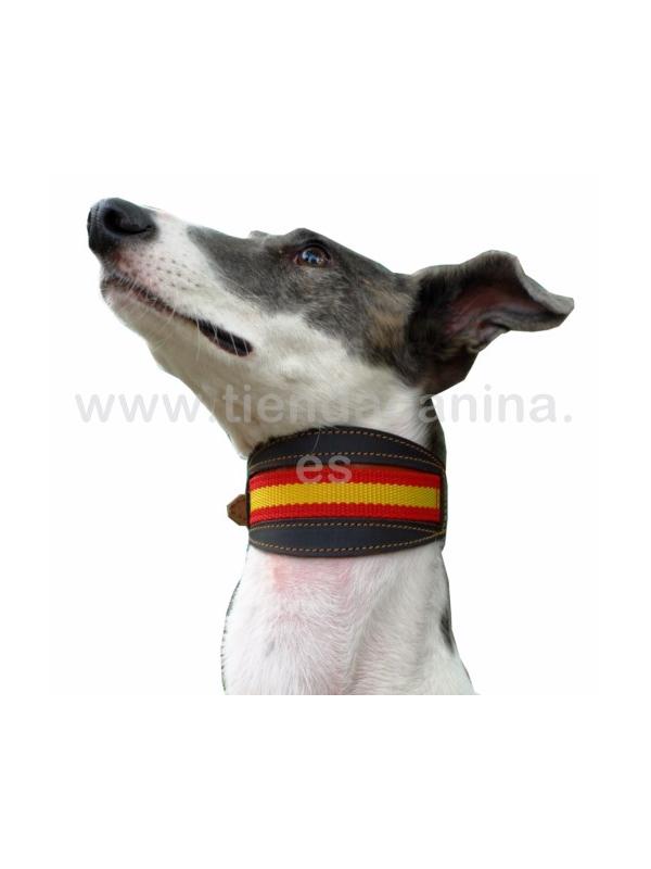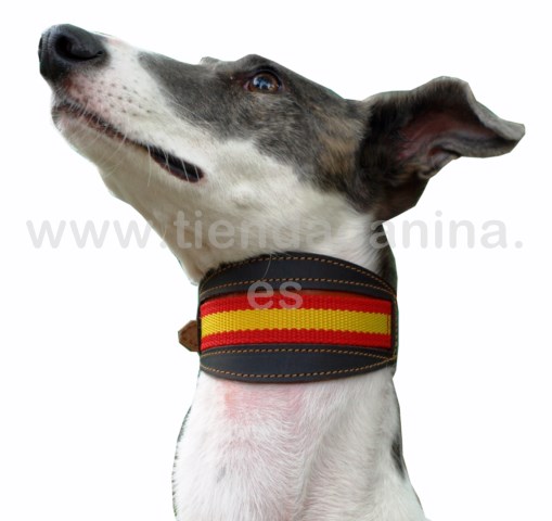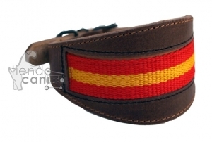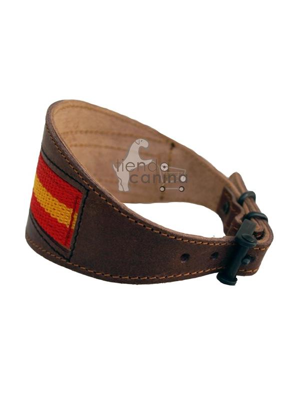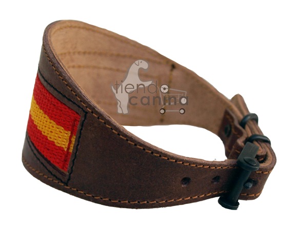Collar de cuero para galgo, podenco y otros perros con cuello fino con bandera española incrustada. Completamente hecho a mano, acabado con una autentica hebilla jerezana.