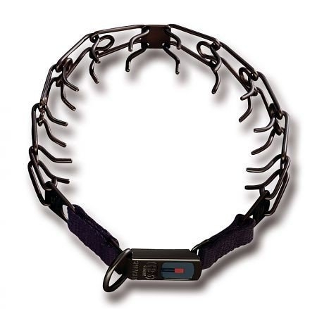 Collar de adiestramiento metálico con púas redondeadas de acero inoxidable negro con cierre fácil "click lock" de la prestigiosa marca Sprenger, para perros difíciles que necesiten más control.